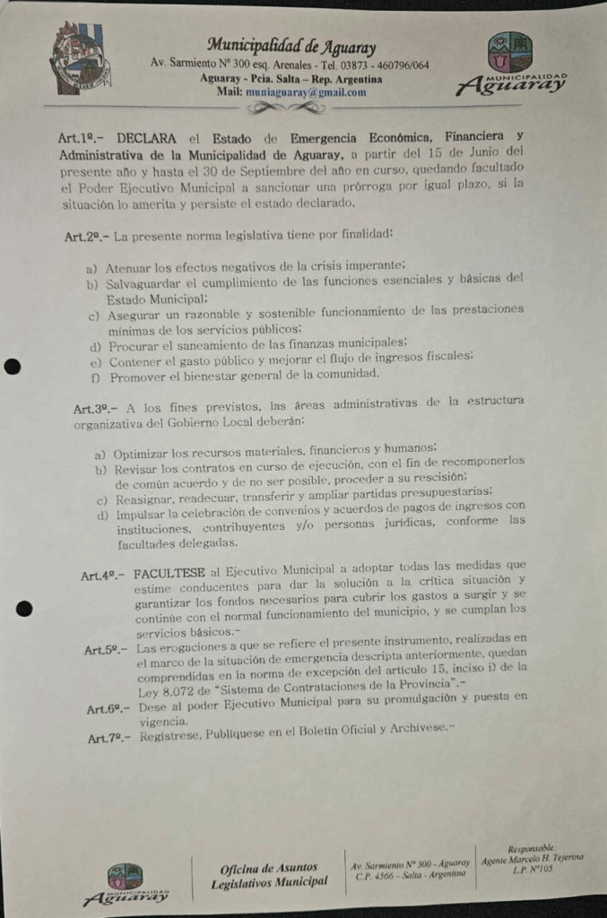 El Concejo Deliberante de Aguaray aprobó una ordenanza remitida por el intendente Guillermo Alleman donde declara la emergencia económica del Municipio. Se redujo el sueldo del intendente y sus funcionarios en un 50% y el de los ediles en un 20%.