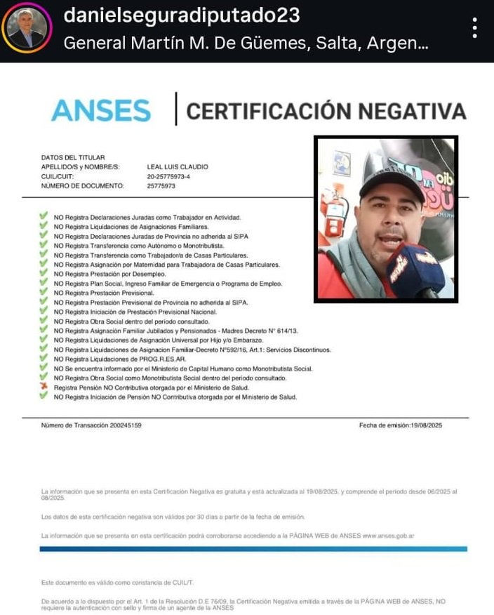 El diputado provincial por el departamento General Güemes, Daniel Segura, confirmó la denuncia al periodista Luis Leal por presuntamente cobrar una pensión por invalidez laboral de manera irregular.