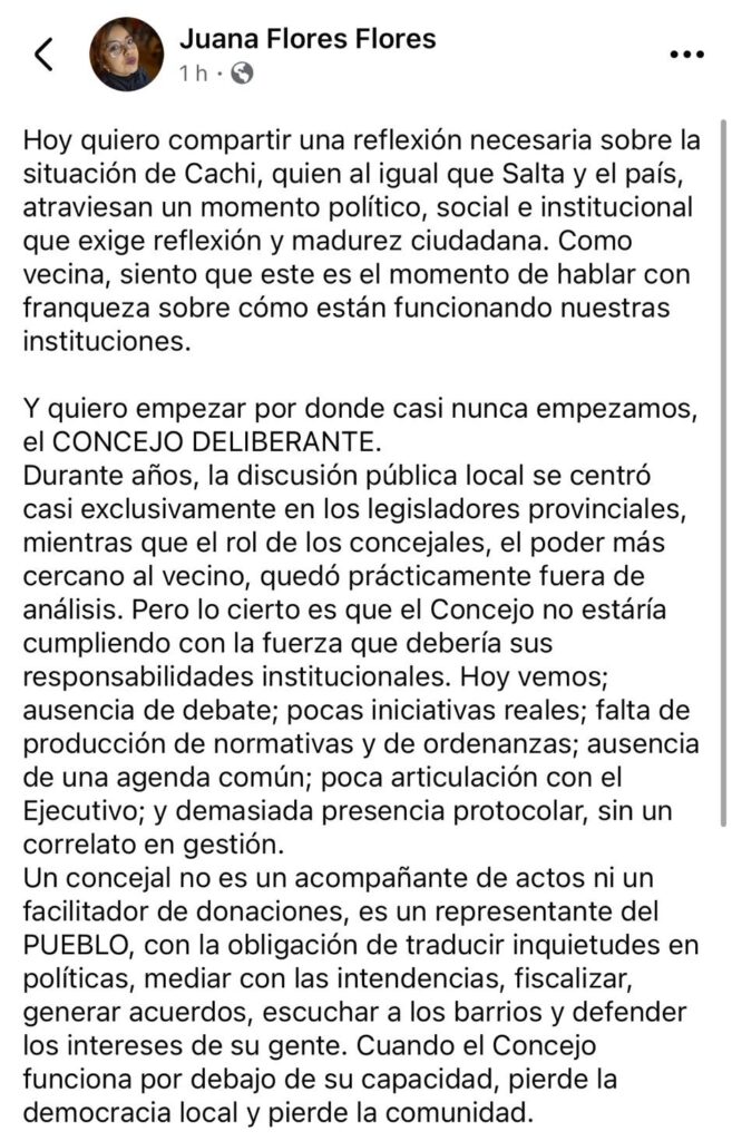 El foco principal de su reclamo se centra en el Concejo Deliberante de Cachi. De esta manera, acusó al organismo de no estar cumpliendo “con la fuerza que debería sus responsabilidades institucionales”.