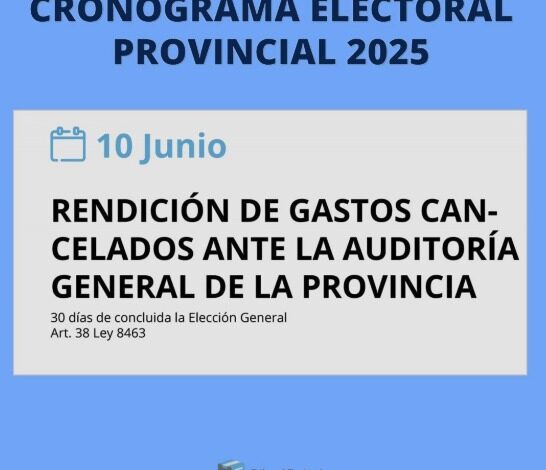 La campaña finalizará el 9 de mayo, dos días antes de los comicios generales programados para el 11 de mayo. Finalmente, la rendición de gastos generales cancelados ante la Auditoría General de la Provincia se llevará a cabo el 10 de junio.