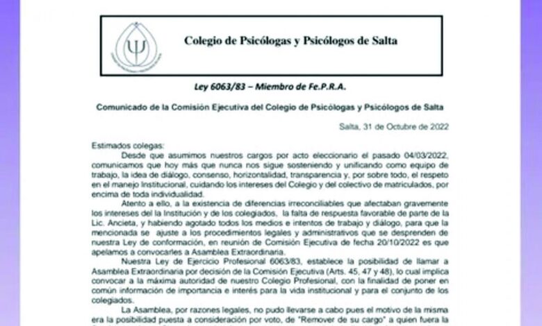 En un comunicado oficial que se dio a conocer ayer en el sitio oficial institucional de esta colegiatura, apelaron al "diálogo, consenso, horizontalidad, transparencia y, por sobre todo, el respeto en el manejo Institucional". Así explicaron que: "la existencia de diferencias irreconciliables que afectaban gravemente los intereses de la Institución y de los colegiados, la falta de respuesta favorable de parte de la licenciada Anzieta, y habiendo agotado todos los medios e intentos de trabajo y diálogo, para que la mencionada se ajuste a los procedimientos legales y administrativos", finalmente convocaron a Asamblea para tratar su destitución.