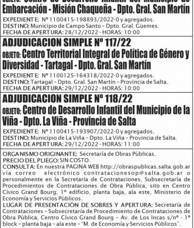 Adjudicacion Simple 116 117 y 118 MESP Adjudicacion Simple 116 117 y 118 MESP Fecha de publicación: 05/12/2022