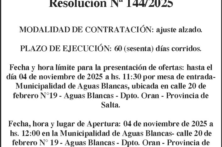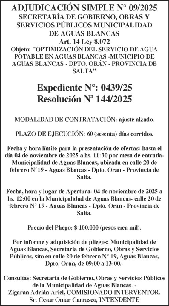 MUNICIPALIDAD DE AGUAS BLANCAS ADJUDICACION SIMPLE Nº 09/2025 Adjudicación Simple Nº 09/2025 Fecha de publicación: 27/10/2025
