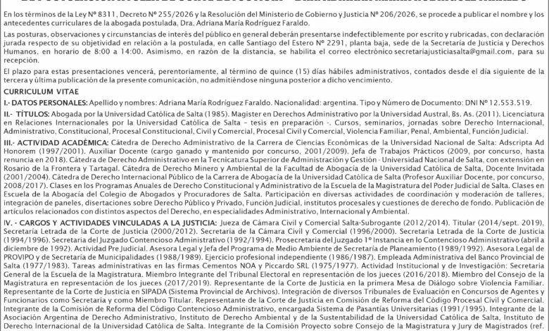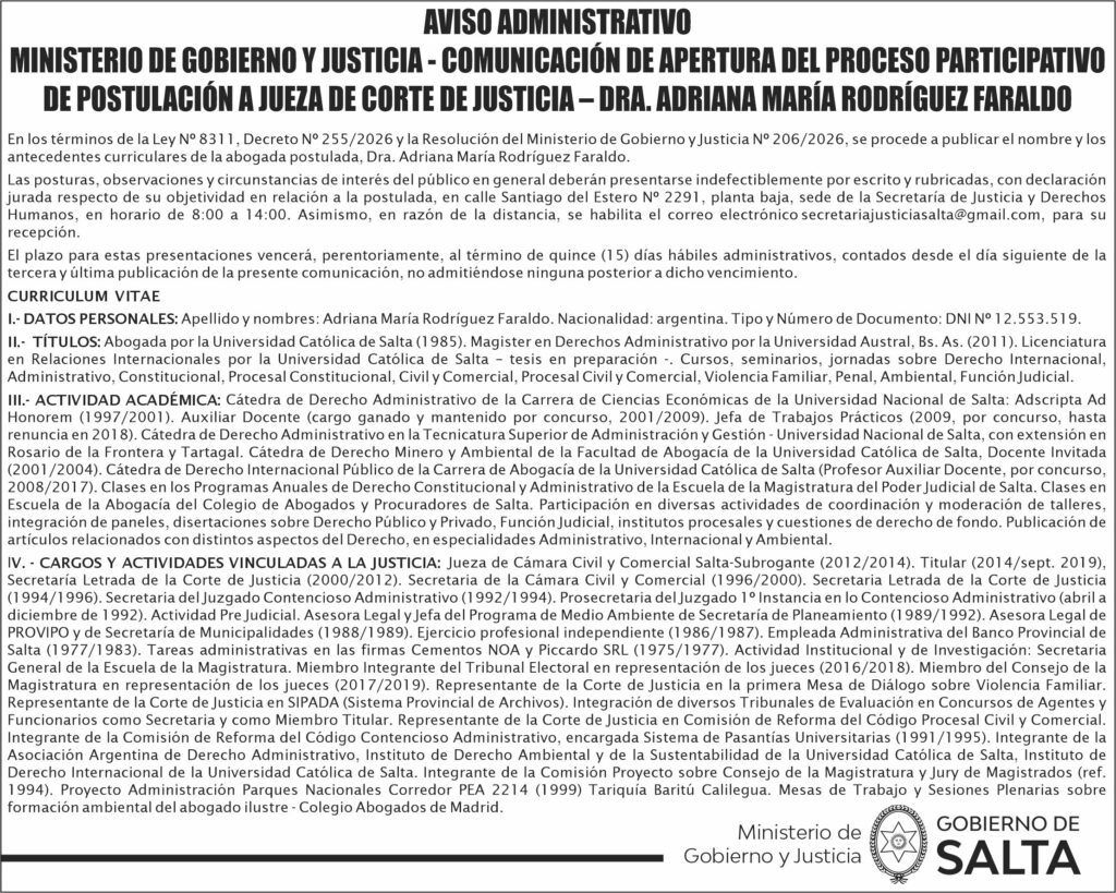 GOBIERNO DE SALTA COMUNICACION DE APERTURA DEL PROCESO PARTICIPATIVO DE POSTULACION A JUEZA DE CORTE DE JUSTICIA. Fecha de publicación: 28/04/2026