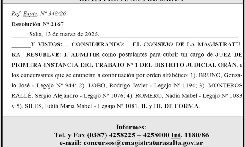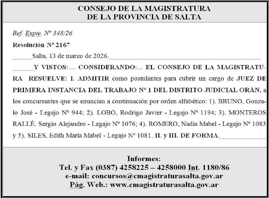 CONSEJO DE LA MAGISTRATURA DE SALTA CONSEJO DE LA MAGISTRATURA Ref. Expte. N° 348/26 Fecha de publicación: 17/03/2026