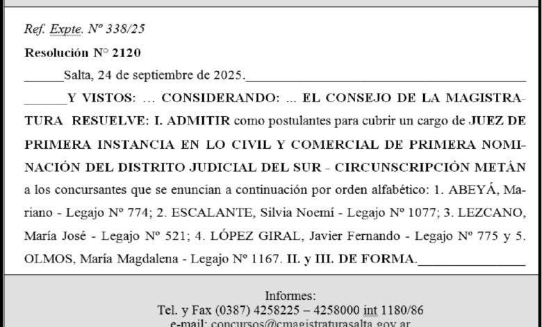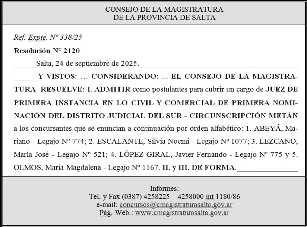 CONSEJO DE LA MAGISTRATURA DE LA PROVINCIA DE SALTA CONSEJO DE LA MAGISTRATURA DE LA PROVINCIA DE SALTA Resolución Nº 2120 Fecha de publicación: 29/09/2025