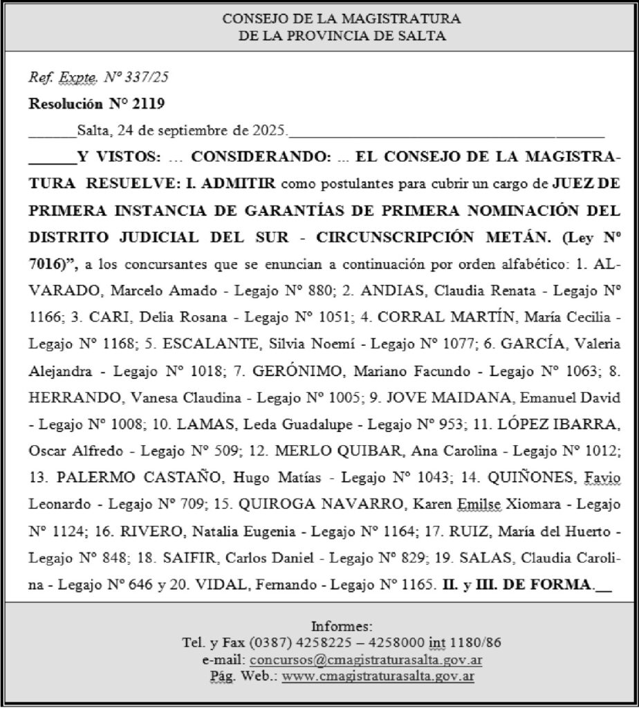 CONSEJO DE LA MAGISTRATURA DE LA PROVINCIA DE SALTA CONSEJO DE LA MAGISTRATURA DE LA PROVINCIA DE SALTA Resolución Nº 2119 Fecha de publicación: 29/09/2025
