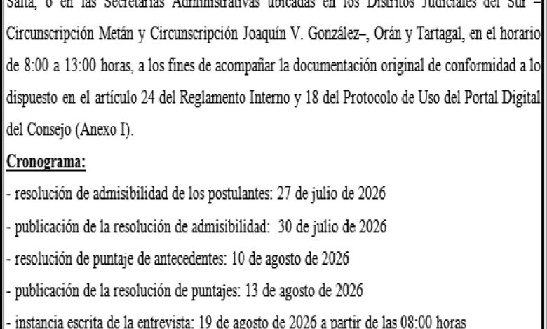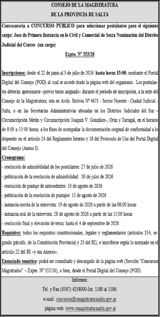 CONSEJO DE LA MAGISTRATURA DE LA PROVINCIA DE SALTA CONSEJO DE LA MAGISTRATURA DE LA PROVINCIA DE SALTA Expte. Nº 353/26 Fecha de publicación: 31/03/2026
