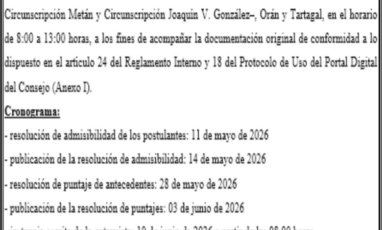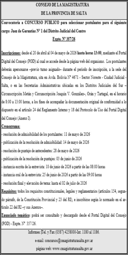 CONSEJO DE LA MAGISTRATURA DE LA PROVINCIA DE SALTA CONSEJO DE LA MAGISTRATURA DE LA PROVINCIA DE SALTA Expte. Nº 357/26 Fecha de publicación: 09/04/2026
