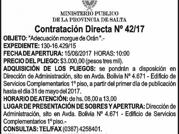 CONTRATACION DIRECTA Nº 42-17 – MINISTERIO PÚBLICO SALTA CONTRATACION DIRECTA Nº 42-17 – MINISTERIO PÚBLICO SALTA Fecha de publicación: 18/05/2017