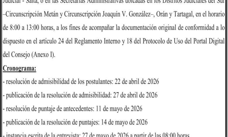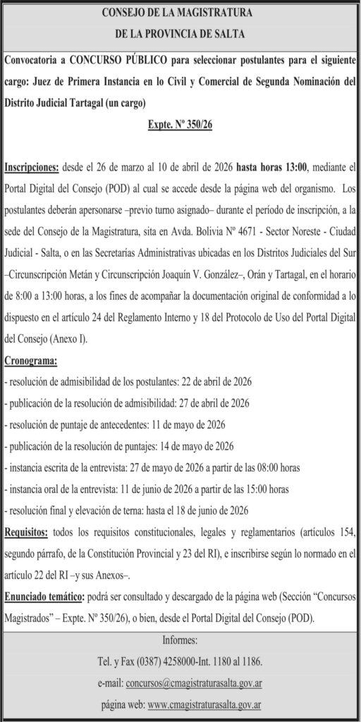 CONSEJO DE LA MAGISTRATURA DE LA PROVINCIA DE SALTA Convocatoria a CONCURSO PÚBLICO Tartagal Expte. Nº 350/26 Fecha de publicación: 19/02/2026