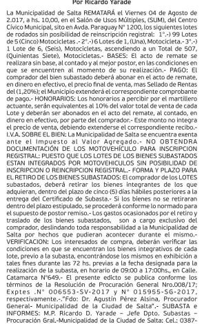 Edicto – Subasta Bienes de Terceros – Municipalidad de Salta Edicto – Subasta Bienes de Terceros – Municipalidad de Salta Fecha de publicación: 03/08/2017