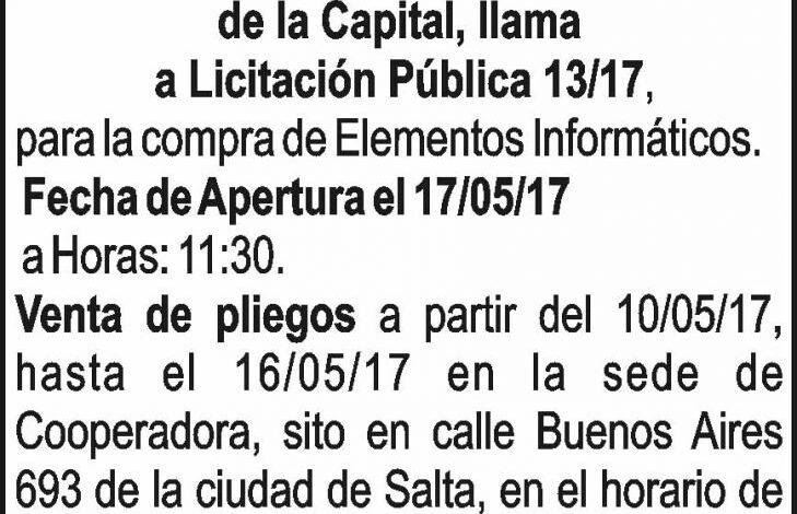 Licitación Publica 13/17 – Cooperadora Asistencial de la Capital Licitación Publica 13/17 – Cooperadora Asistencial de la Capital Fecha de publicación: 04/05/2017
