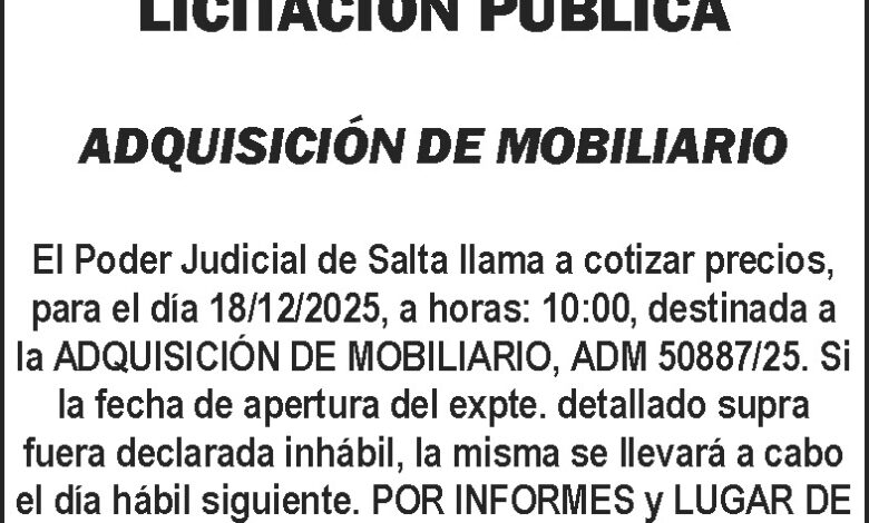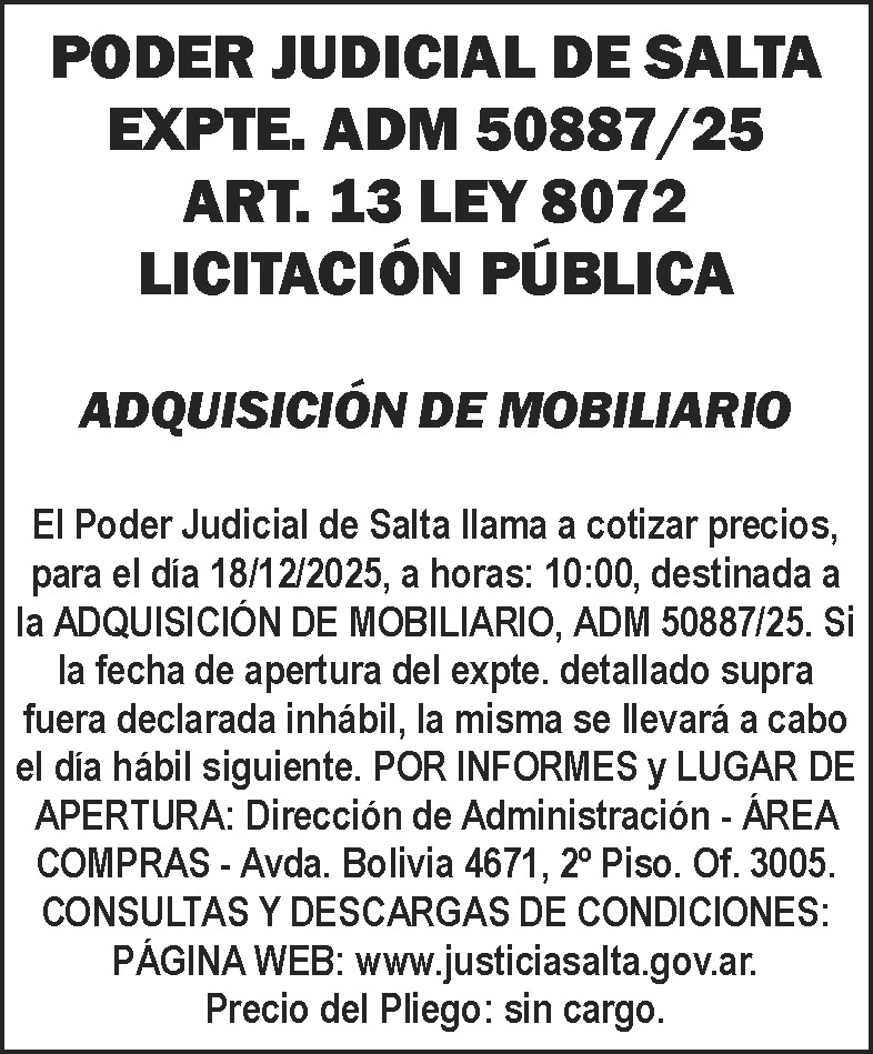PODER JUDICIAL DE LA PROVINCIA DE SALTA LICITACION PUBLICA Expte. ADM 50887/25 Fecha de publicación: 02/12/2025