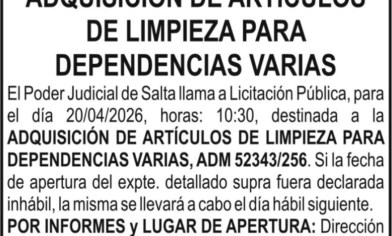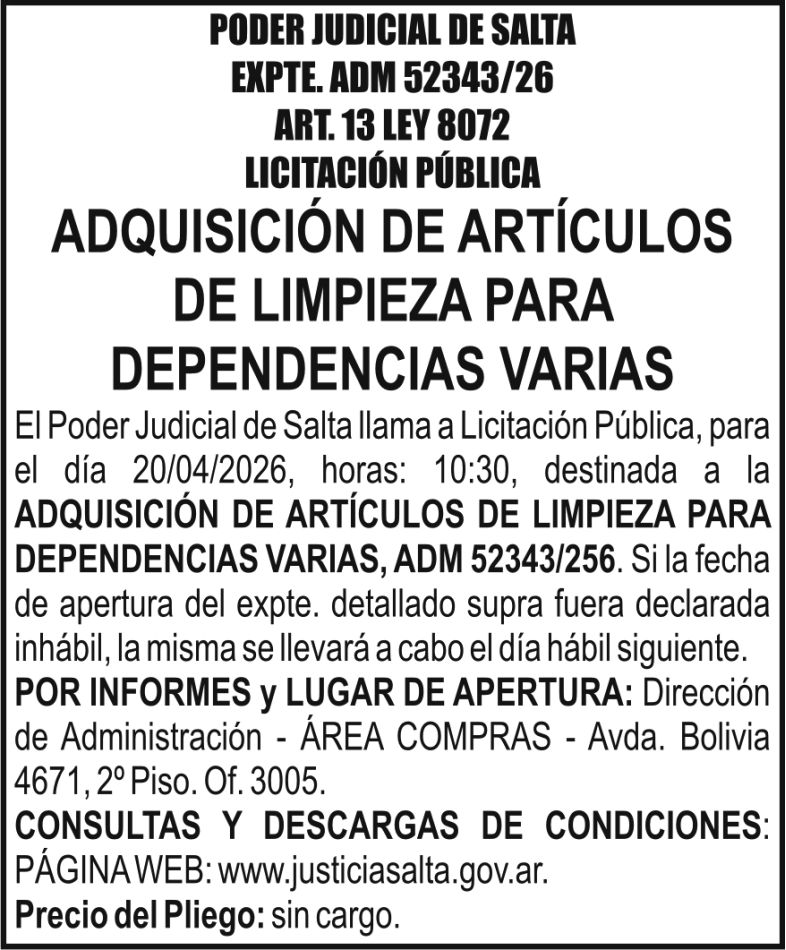 PODER JUDICIAL DE LA PROVINCIA DE SALTA LICITACION PUBLICA Expte. Adm 52343/26 Fecha de publicación: 31/03/2026