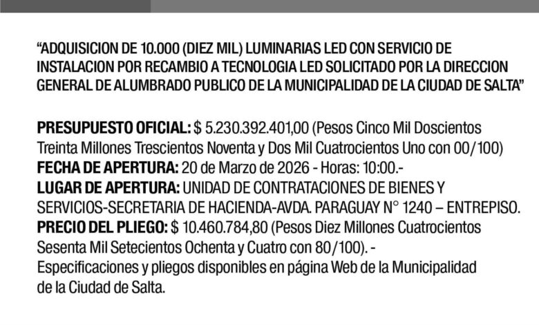 MUNICIPALIDAD DE SALTA LICITACIÓN PÚBLICA N° 02/26 Expte N° 75182-SG-2025 Fecha de publicación: 12/03/2026