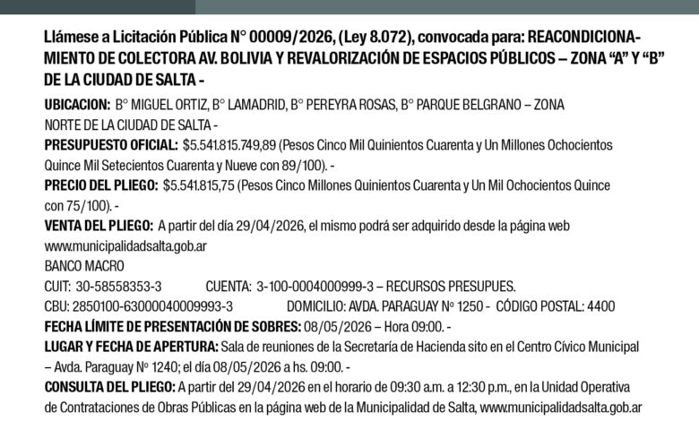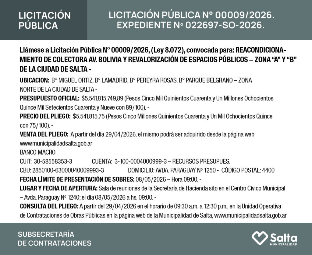 MUNICIPALIDAD DE LA CIUDAD DE SALTA LICITACION PUBLICA N° 09/2026 Licitación Pública N° 09/2026 Fecha de publicación: 29/04/2026