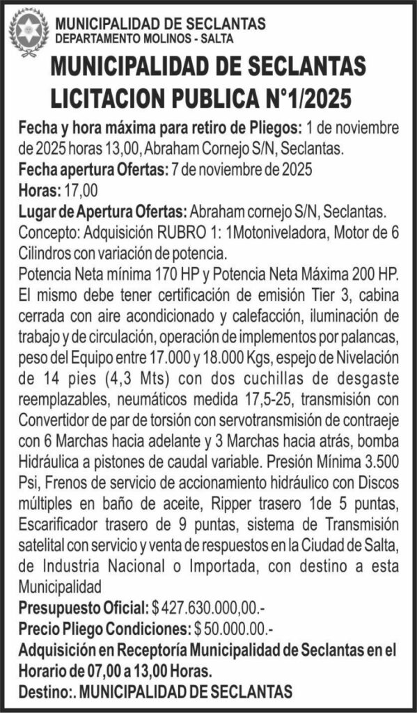 MUNICIPALIDAD DE SECLANTAS LICITACION PUBLICA N° 1/2025 Licitación Pública N° 1/2025 Fecha de publicación: 30/10/2025