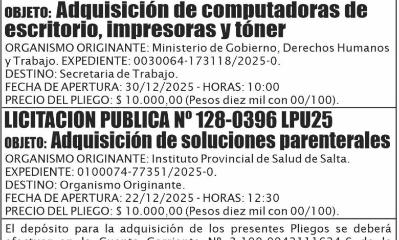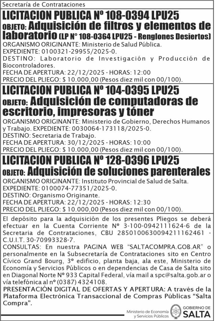 GOBIERNO DE SALTA LICITACION PUBLICA N° 108-0394 LPU25 Licitación Pública N° 108-0394 LPU25 Fecha de publicación: 11/12/2025