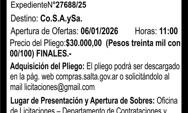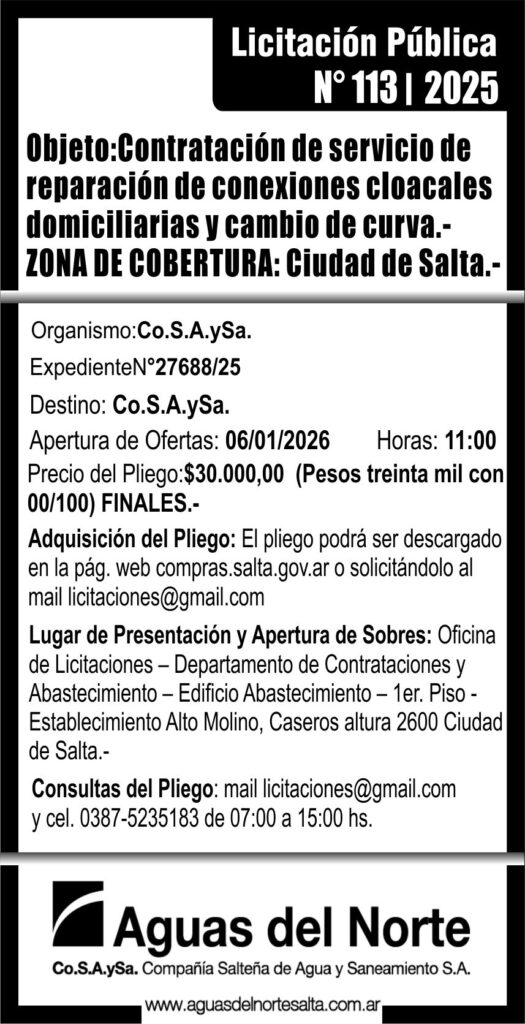 COMPAÑIA SALTEÑA DE AGUA - AGUAS DEL NORTE LICITACION PUBLICA N° 113/2025 Licitación Pública N° 113/2025 Fecha de publicación: 12/12/2025