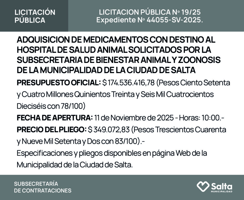 MUNICIPALIDAD DE LA CIUDAD DE SALTA LICITACION PUBLICA N 19/25 Licitación Pública N 19/25 Fecha de publicación: 01/11/2025