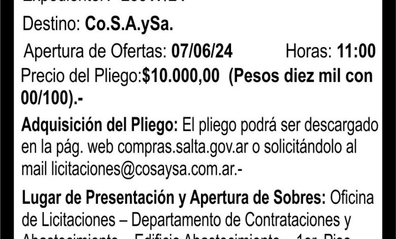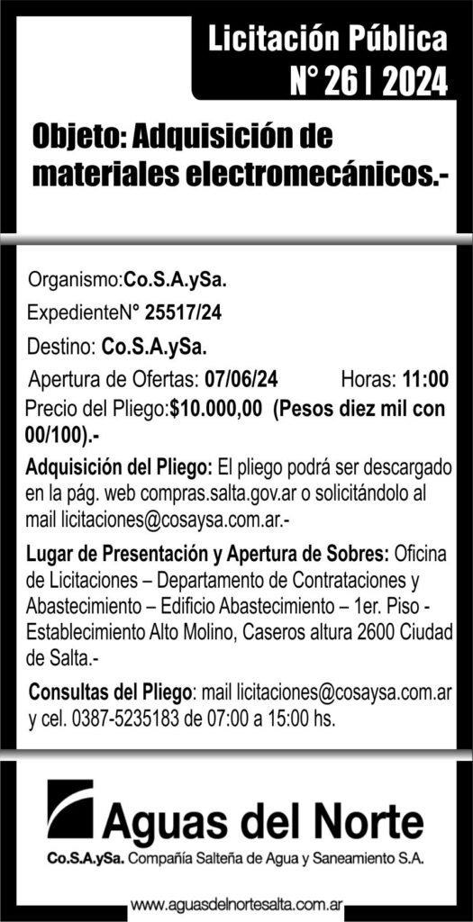 Compañía Salteña de Agua y Saneamiento S.A. LICITACION PUBLICA N 26 Licitación Pública N 26 Fecha de publicación: 22/05/2024