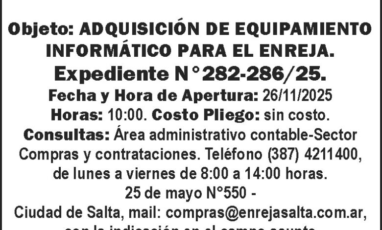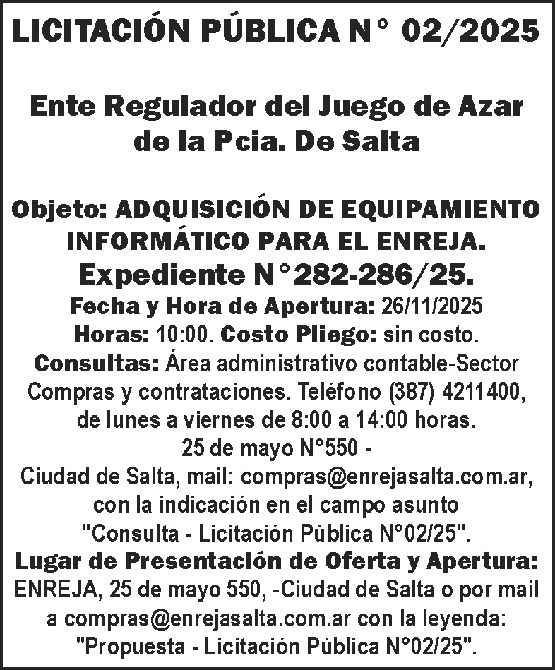 ENTE REGULADOR DEL JUEGO DE AZAR DE LA PCIA. DE SALTA LICITACION PUBLICA Nº 02/2025 Licitación Pública Nº 02/2025 Fecha de publicación: 07/11/2025