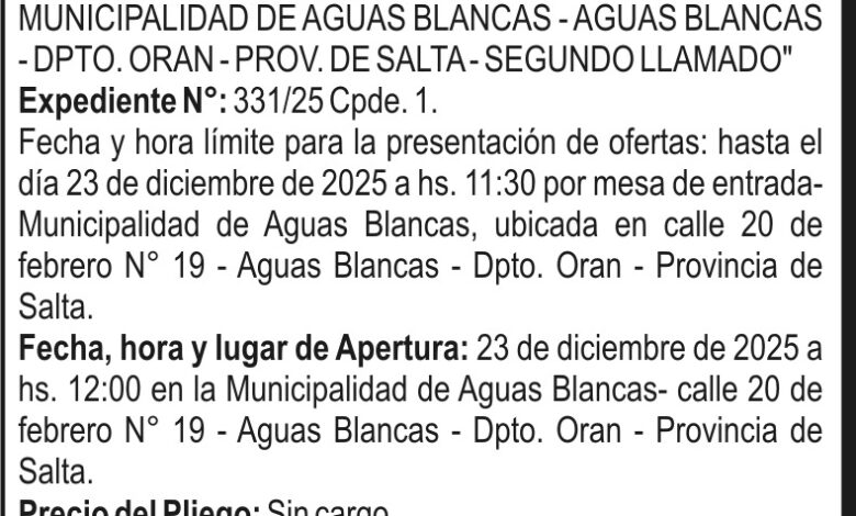 MUNICIPALIDAD DE AGUAS BLANCAS LICITACION PUBLICA Nº 03/2025 Licitación Pública Nº 03/2025 Fecha de publicación: 06/12/2025