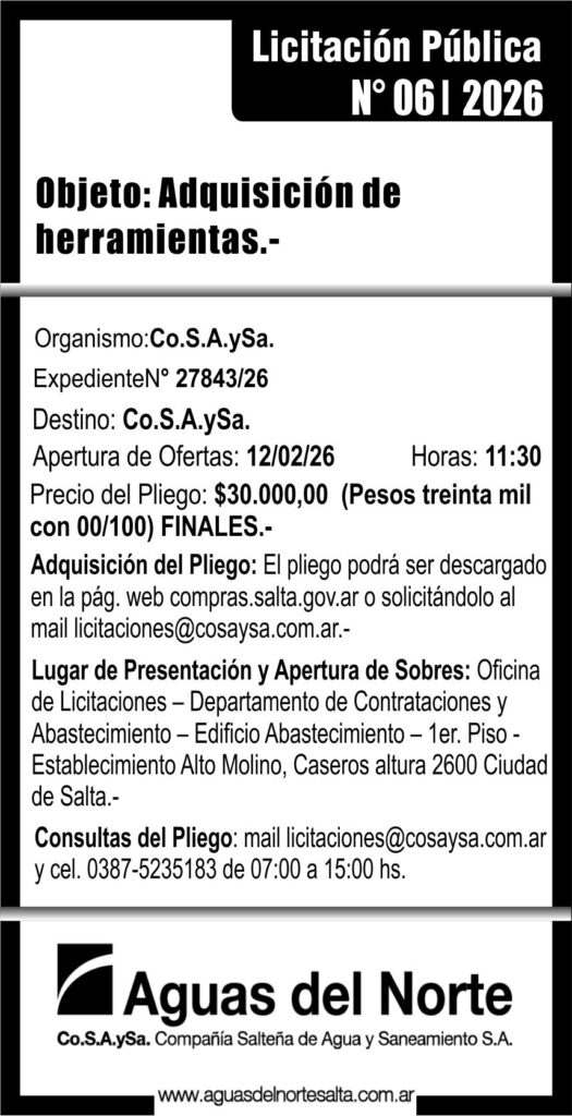 COMPAÑIA SALTEÑA DE AGUA - AGUAS DEL NORTE LICITACION PUBLICA Nº 06/2026 Licitación Pública Nº 06/2026 Fecha de publicación: 23/01/2026