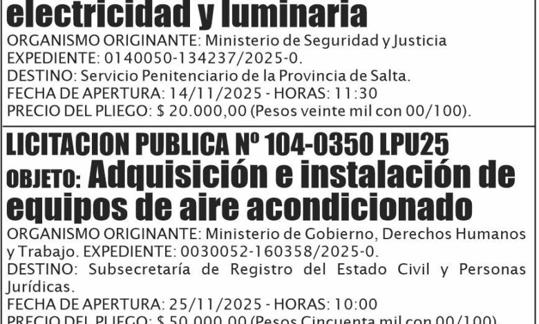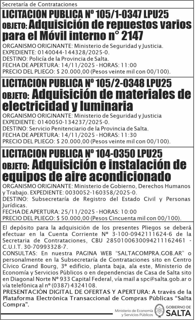GOBIERNO DE SALTA LICITACION PUBLICA Nº 105/1-0347 LPU25 Licitación Pública Nº 105/1-0347 LPU25 Fecha de publicación: 06/11/2025