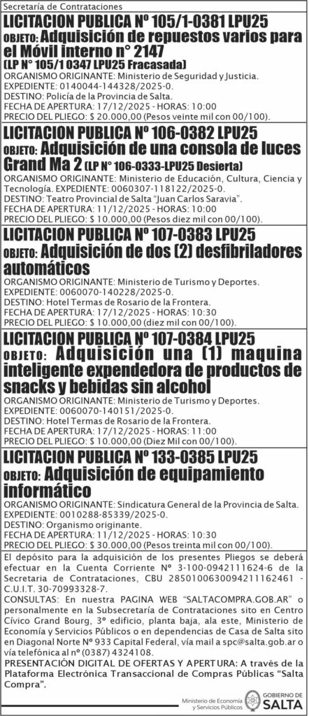 GOBIERNO DE SALTA LICITACION PUBLICA Nº 105/1-0381 LPU25 Licitación Pública Nº 105/1-0381 LPU25 Fecha de publicación: 02/12/2025