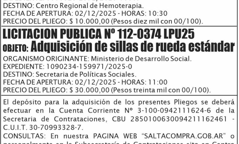 GOBIERNO DE SALTA LICITACION PUBLICA Nº 108-0373 LPU25 Licitación Pública Nº 108-0373 LPU25 Fecha de publicación: 20/11/2025
