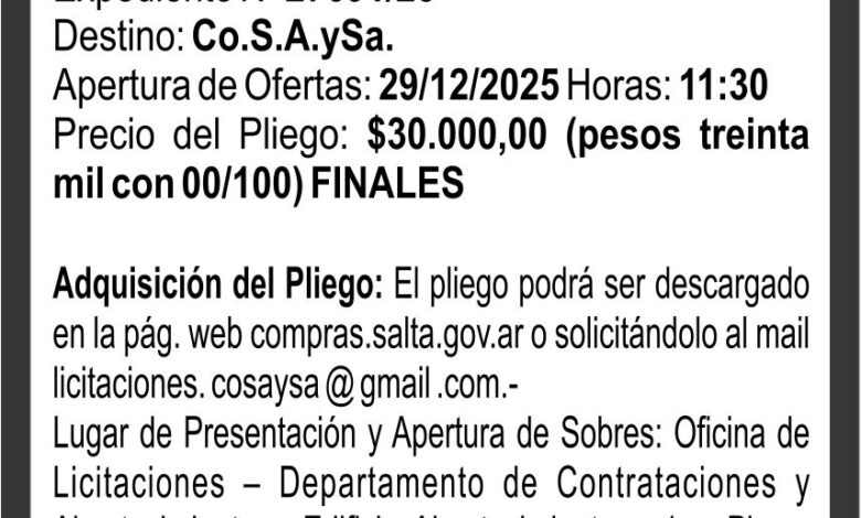 COMPAÑIA SALTEÑA DE AGUA - AGUAS DEL NORTE LICITACION PUBLICA Nº 110/2025 Licitación Pública Nº 110/2025 Fecha de publicación: 10/12/2025