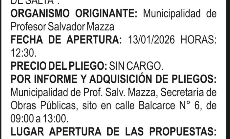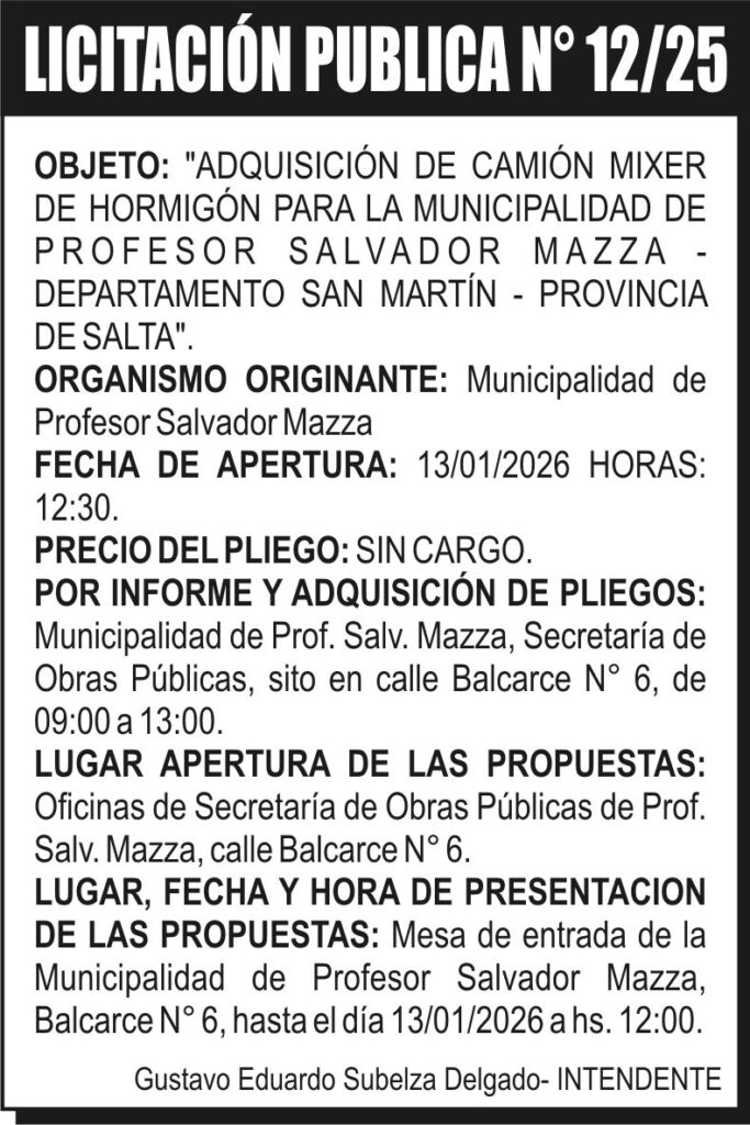 MUNICIPALIDAD DE SALVADOR MAZZA LICITACION PUBLICA Nº 12/25 Licitación Pública Nº 12/25 Fecha de publicación: 23/12/2025