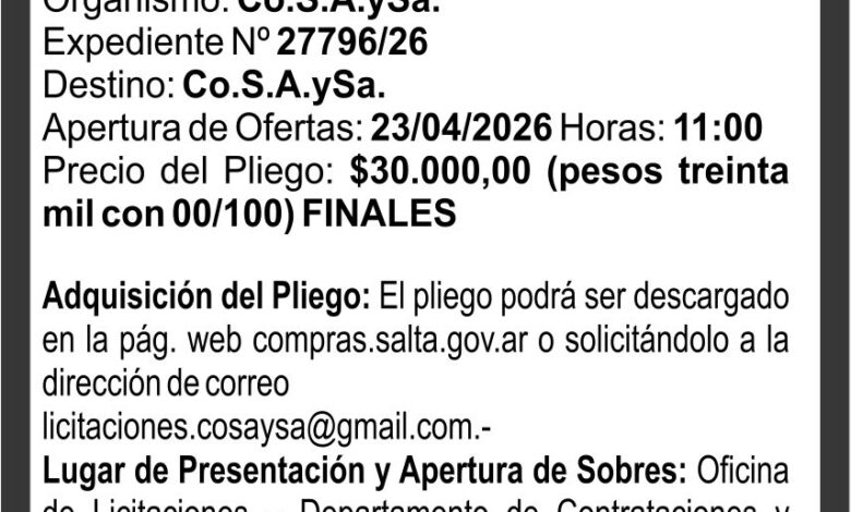 COMPAÑIA SALTEÑA DE AGUA - AGUAS DEL NORTE LICITACION PUBLICA Nº 21/2026 Licitación Pública Nº 21/2026 Fecha de publicación: 07/04/2026