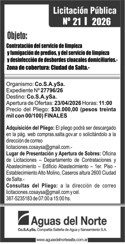 COMPAÑIA SALTEÑA DE AGUA - AGUAS DEL NORTE LICITACION PUBLICA Nº 21/2026 Licitación Pública Nº 21/2026 Fecha de publicación: 07/04/2026