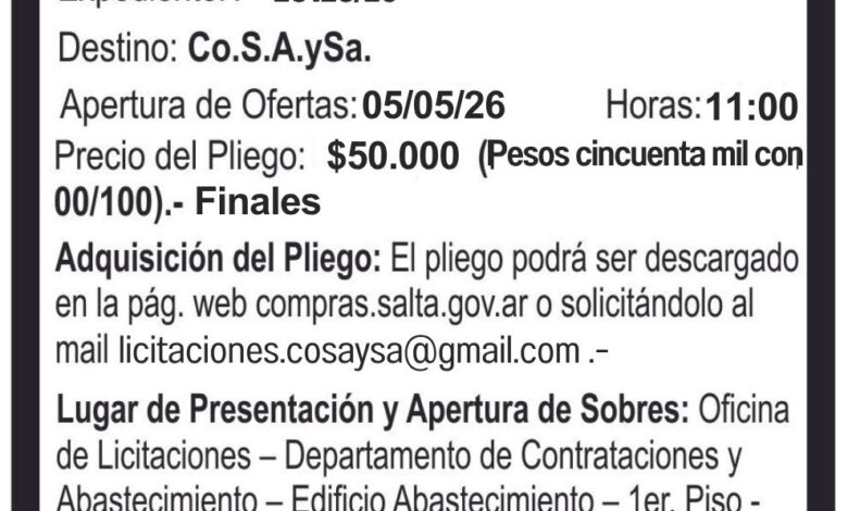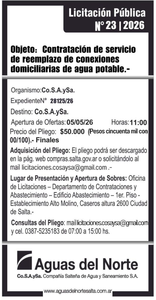 COMPAÑIA SALTEÑA DE AGUA - AGUAS DEL NORTE LICITACION PUBLICA Nº 23/2026 Licitación Pública Nº 23/2026 Fecha de publicación: 16/04/2026
