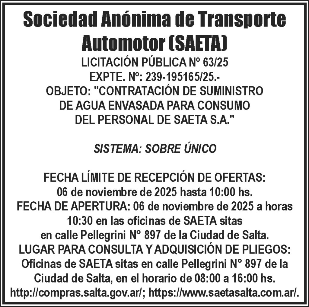 SOCIEDAD ANONIMA DE TRANSPORTE AUTOMOTOR - SAETA LICITACION PUBLICA Nº 63/25 Licitación Pública Nº 63/25 Fecha de publicación: 22/10/2025