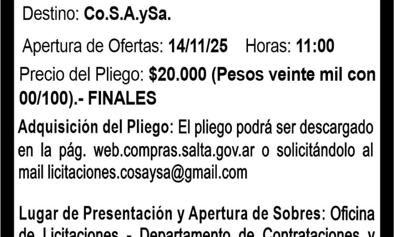 COMPAÑIA SALTEÑA DE AGUA - AGUAS DEL NORTE LICITACION PUBLICA Nº 92/2025 Licitación Pública Nº 92/2025 Fecha de publicación: 29/10/2025