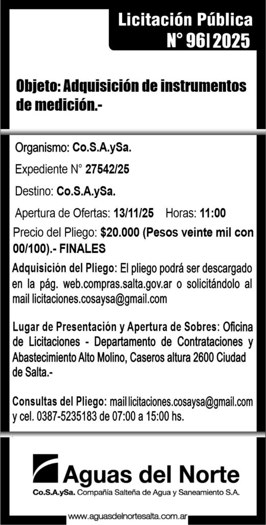 COMPAÑIA SALTEÑA DE AGUA - AGUAS DEL NORTE LICITACION PUBLICA Nº 96/2025 Licitación Pública Nº 96/2025 Fecha de publicación: 29/10/2025