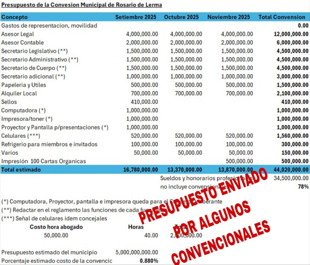 Según detalló, las pretensiones incluyen la compra de computadoras e impresoras nuevas para cada convencional, 500 juegos de fotocopias de la Carta Orgánica y la designación de asesores y secretarios privados con sueldos millonarios. Ramos recordó que el cargo de Convencional es ad honorem y cuestionó que algunos intenten transformarlo en un espacio de privilegios.