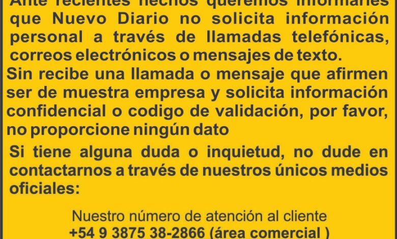 Desde Nuevo Diario advertimos a nuestra comunidad y a nuestros clientes sobre intentos de estafa detectados en las últimas horas. En estos intentos, personas desconocidas utilizan de manera fraudulenta el nombre de nuestro medio para …