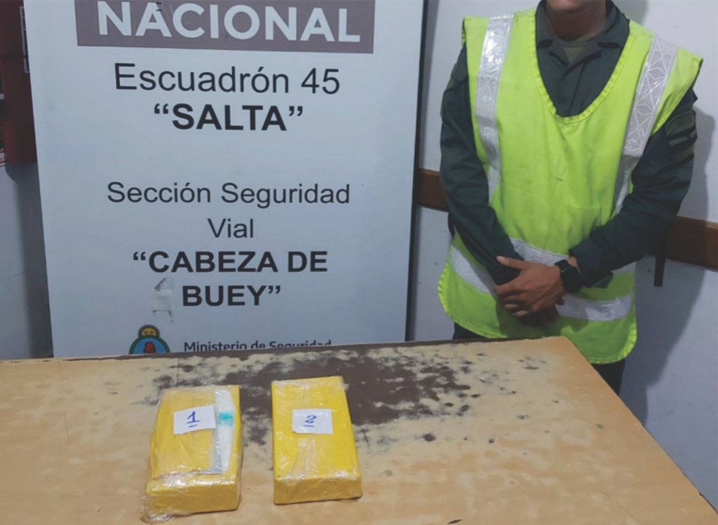 El primer hallazgo se produjo alrededor de las 3:30 de la madrugada, cuando efectivos de la Sección Seguridad Vial “Cabeza de Buey” del Escuadrón 45 “Salta” inspeccionaron un colectivo que viajaba desde San Salvador de Jujuy hacia Esquel, en la provincia de Chubut. La unidad fue sometida a una revisión de rutina, en la que se controlaron tanto los espacios comunes como los compartimentos internos del vehículo. Durante la requisa del rodado, los gendarmes detectaron dos paquetes ocultos en el tacho de basura del baño del micro. Tras su apertura, se confirmó que contenían cocaína con un peso total de 2 kilos 144 gramos.