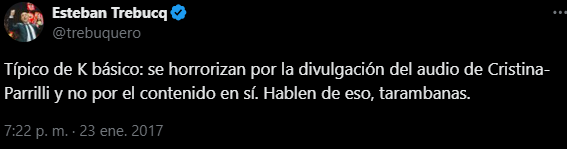 En aquel momento, escribió en Twitter: “Típico de K básico: se horrorizan por la divulgación del audio de Cristina-Parrilli y no por el contenido en sí. Hablen de eso, tarambanas”.